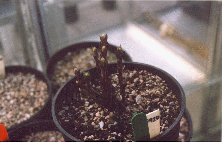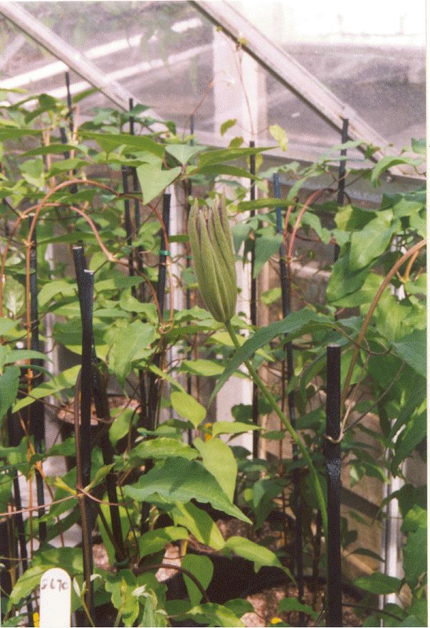 Even by mid-January 2002, seedlings raised the previous season (1st photo) re-appear with surprising vigour and strength...by Feb 1st: some seedlings quickly develop flower buds (photo 2), which can be clearly seen. Not surprisingly, this plant, G74E, already with flower buds in February, becomes the first of the season to flower - see below. The plants have already been restricted to two vines. By the end of February; it's time to stake (3) the more-active plants..and by early March 2002 the plants are well on the way: by now all require staking (4).