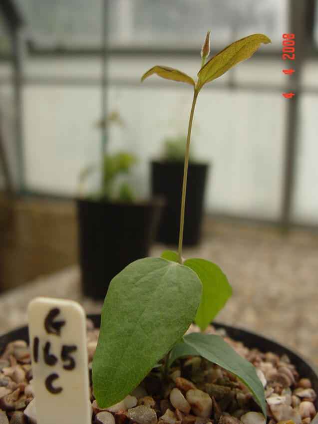 Once past the early seedling stages and into extension growth, the middle-season germinators can sometimes develop reasonable lengths of vine, and, given sufficient time, these vines will ripen and harden somewhat and darken from the initial green, eventually to brown. If these initial growths are tied carefully to stakes at intervals as they extend, it is easy to protect them from breakage, and they will often persist over winter, even if the extremities die off. The vines are easy to manipulate and tend. In spring, these previous-season old vines may carry flower buds. (You may yet have to wait for the first flower until later in the season or next year; in which case, you do just the same thing.......preserve some of the old vines for the next season. They will almost certainly produce early season flowers the next time around.)