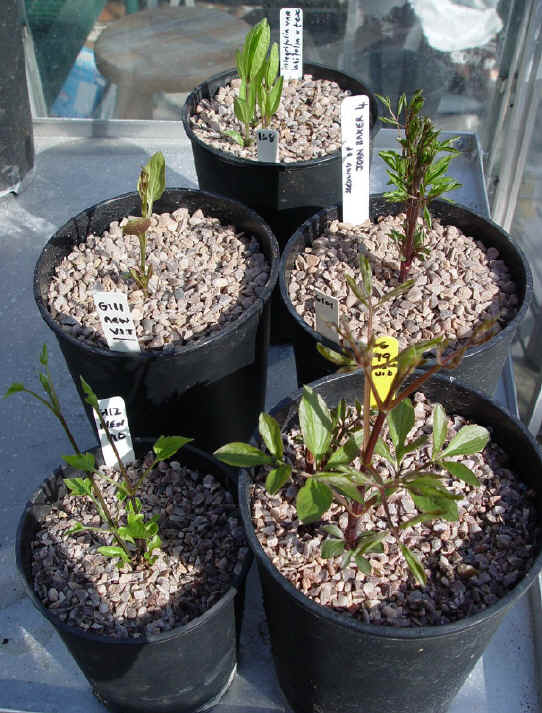 Next year's brand-new large-flowered hybrids are ready now. The total is just 44 plants, at this stage. Some of the current year's vines have been retained - they will often produce early flowers in the new season, from this old wood. Most of this present foliage will rot away in the next few weeks as winter comes in.