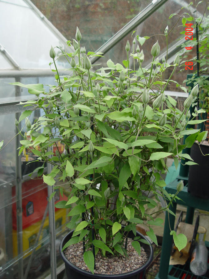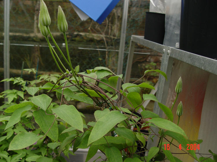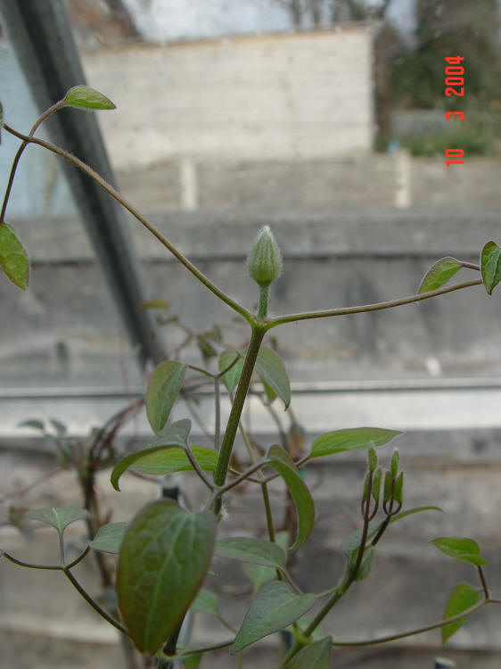 A lovely atragene, "Jutta"; a plant raised by Finn Rosholm. Further photos to follow when flowers open - see the colour. This plant arrived as a tiny cutting on 25th May 2003. The plant settled in over a period, re-emerged in January, and is set to flower this week or next.