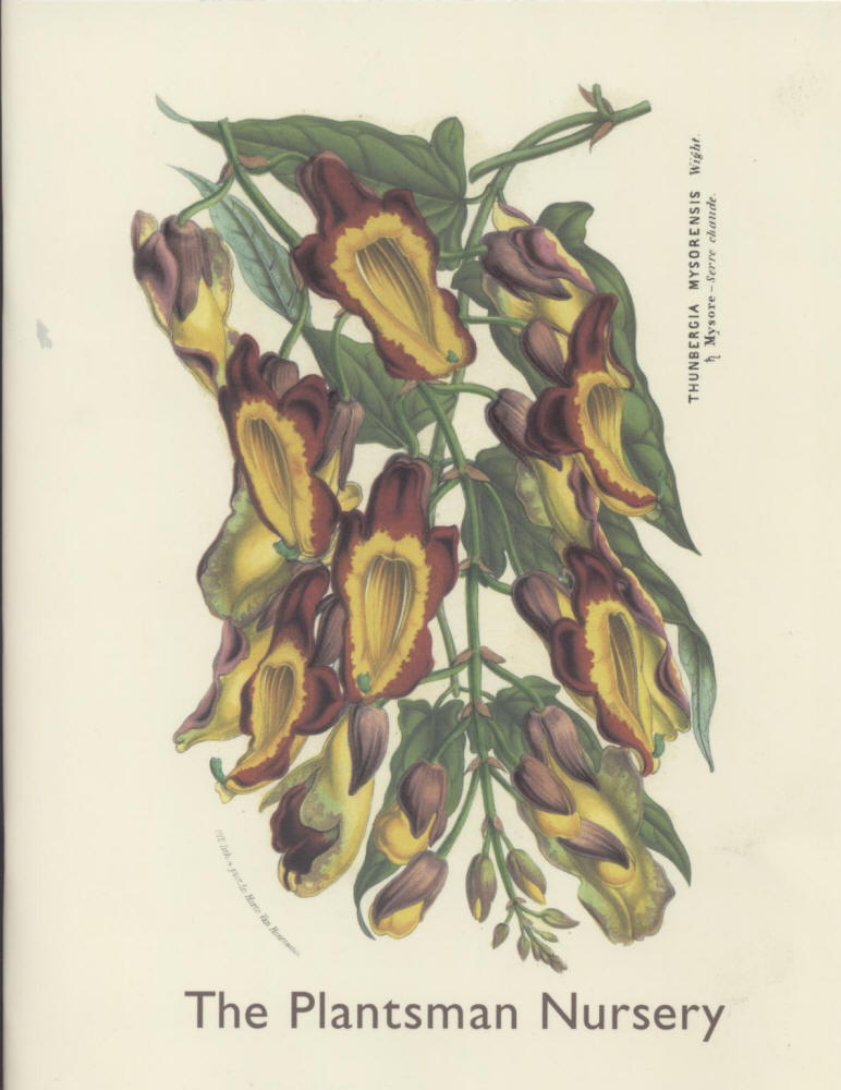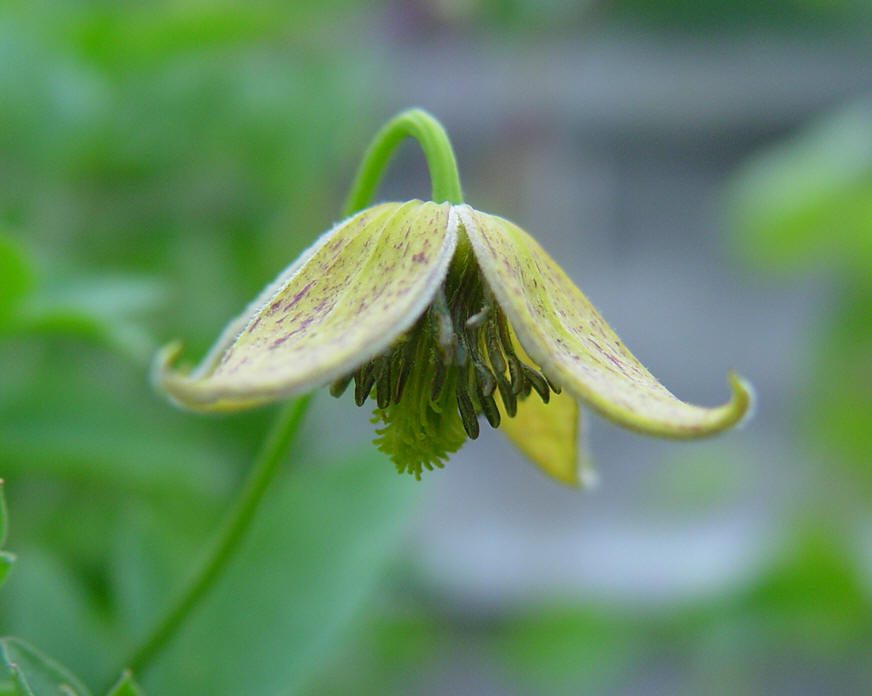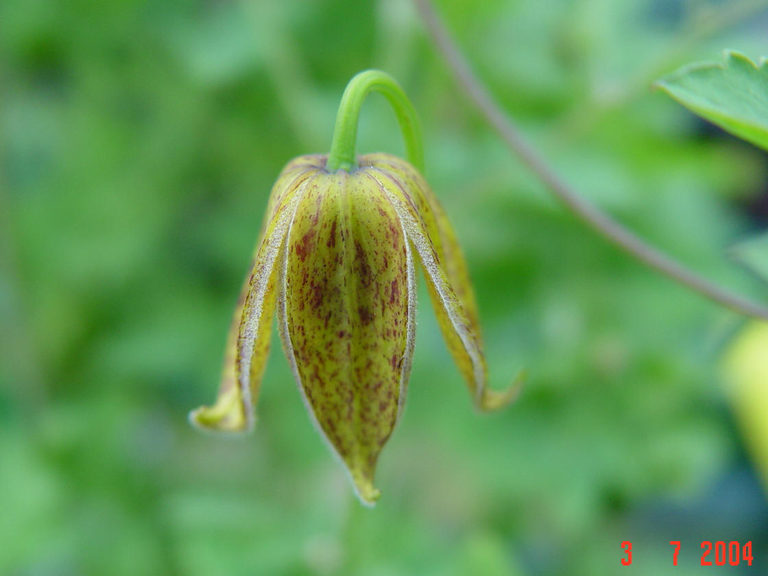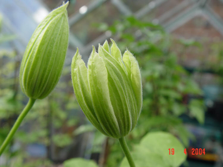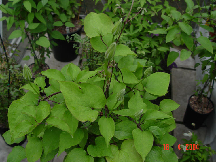 Clematis napaulensis; seed planted 11th July 1998, germinated 22nd September 1998, after about 70 days. In the last few years the plant has produced sporadic flowers in too-cold a garden, but this year the vines have begun to develop flowers earlier than in previous years, and in much greater numbers.