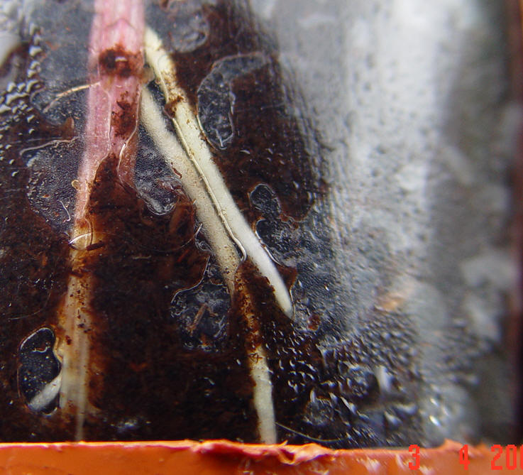 You can directly see roots as they arise from the stem of the cutting. If you look closely you can notice a swelling or nodule, that shortly forms into a second root, immediately above the first. (Note the first picture showing the outer pot, within which the cutting-pot is placed, so as to keep the subject, which is in the window, in the dark.) The further pictures show more roots arising and extending as the days slip by.