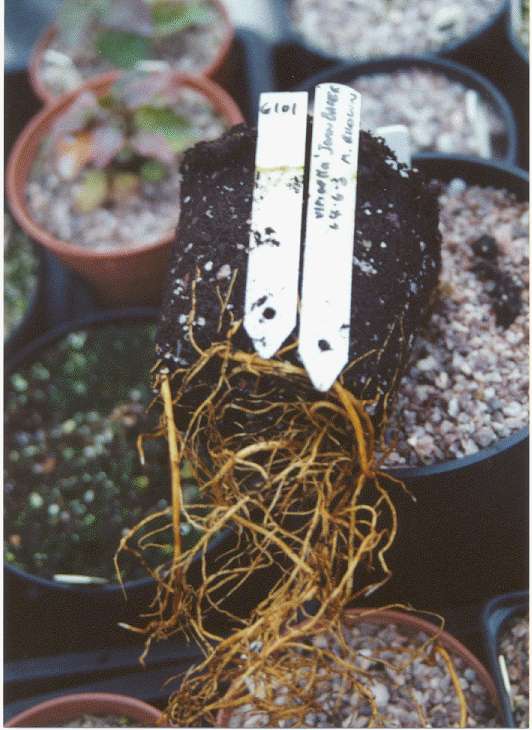 Photographed during the cold spell between Christmas and New Year, this LFH seedling has already produced a new shoot from the base. The fine gravel on top has been removed, so the shoot can be seen more easily. At the time of taking the photo all my seed-pots, seedling-pots and plant-pots were frozen solid. We had four days of continuous freeze, after which everything thawed out, but the seedlings came through fine. (Stop press: we had another freeze period recently, in February-March; all pots frozen once again for several days, but fortunately no calamities or seedlings lost!) The seedling below germinated 12 months ago. By now, the root system is quite well developed: