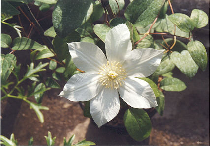 Below, another white seed-raised clematis; these two images show T117's first flower in September 1999, on the left, and the first flower in May 2000, on the right.